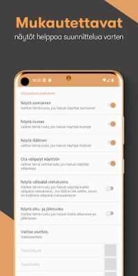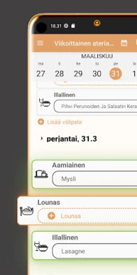 Ateriasuunnittelumoduuli on suunniteltu intuitiiviseksi ja tehokkaaksi. Pyyhkäise helposti viikkojen välillä ja muokkaa aterioita nopeasti painalluksella – tai siirrä ja vaihda aterioita vaivattomasti pitkällä painalluksella. Määrittele omia ateriasääntöjäsi, olipa kyseessä 'kanapäivä maanantaina' tai 'vähintään yksi kasvisateria viikossa' – tämä työkalu toteuttaa ne. Löydä ja tallenna reseptejä verkosta, merkitse ainesosat kaloreineen ja glykeemisine indekseineen, ja piilota tarvittaessa aamu-, lounas- tai ilta-ateriat asetuksista. Et unohda enää mitään; sovellus muistaa usein käyttämäsi ateriat ja ehdottaa niitä listalta. Lisäksi voit vastaanottaa käteviä ilmoituksia kuluvan päivän ja seuraavan päivän ruokalistoista, varmistaen, että pysyt aina askeleen edellä.