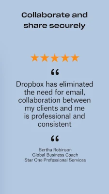 Dropbox pitää tiedostosi järjestyksessä, turvassa ja saatavilla milloin tahansa. Jaa suuria tai pieniä tiedostoja vaivattomasti linkin avulla. Tallenna kaikki tärkeät tiedostot yhteen paikkaan ja varmuuskopioi puhelimesi tai tietokoneesi helposti. Skannaa ja järjestele asiakirjat turvallisesti.