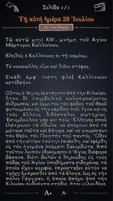 Sen lisäksi, että ohjelma esittää automaattisesti kunkin päivän liturgiset tekstit ja pyhät, voit vaivattomasti navigoida ja avata myös muita kirjoja tarpeen mukaan. Sovellus sisältää älykkäitä toimintoja, kuten kyvyn laskea ja näyttää päivän katabasiat sekä monet liikkuvat pyhien juhlat. Ainutlaatuisena uutuutena ohjelma kykenee kääntämään minkä tahansa liturgisen tekstin osan – yksittäisiä sanoja, lauseita tai kokonaisia kappaleita – sekä lukemaan tekstit ääneen realistisella kreikkalaisella äänellä. Tämä kaikki on käytettävissä täysin ilman internetyhteyttä, mikä takaa keskeytymättömän pääsyn hengelliseen aarteistoon missä ja milloin tahansa. Lisäksi näet helposti päivän paastotiedot ja liturgisen sävelen.