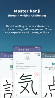 Syvennä kanji-osaamistasi monipuolisten opiskelutapojen avulla. Flashcard-harjoitukset auttavat ulkoa opettelussa hallittavan kokoisissa sarjoissa, visualisoiden piirtoanimaatiot, lukutavat, merkitykset ja esimerkit. Voit räätälöidä korttien teeman, asettelun ja pyyhkäisytoiminnot oppimistyyliisi sopivaksi, arvioimalla kanjeja ja suodattamalla ne pois edistymisesi mukaan. Monivalintatehtävät puolestaan mukautuvat tuloksiisi ja tarjoavat haasteita lukutavoista, merkityksistä ja esimerkkisanoista, sisältäen JLPT- ja yleisiä sanastoja. Kirjoitushaasteet vievät oppimisen uudelle tasolle, auttaen sinua muistamaan ja kirjoittamaan kanjeja oikeassa piirtojärjestyksessä tarkan piirtohavainnointialgoritmin avulla. Ohjeet ilmestyvät tarvittaessa, ja voit arvioida tarkkuutta piirto piirrolta tai itsearviointitilassa.