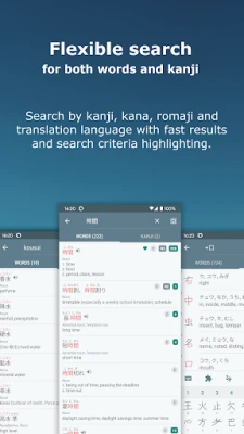 Kattava ja välitön hakutoiminto toimii offline-tilassa, mahdollistaen yli 6000 kanjin ja 180 000 sanan etsinnän yhdellä tekstihaulla. Voit yhdistää hakukriteerejä, kuten lukutapoja, radikaaleja, piirtomääriä tai tasoja, nähden tulokset korostettuina. Yksityiskohtaiset tietosivut esittelevät animoidut piirrot, lukutavat, merkitykset ja henkilökohtaiset tilastosi. Syvenny radikaalien jaotteluun, esimerkkisanoihin, -lauseisiin ja -nimiin, navigoiden helposti sisällössä. Lisäominaisuudet mahdollistavat opiskelun JLPT- ja koululuokkajärjestyksissä, kustomoidut muistutukset, yli 8000 äänitiedoston tuen ja pikakuvakkeet kotinäytölle. Tallenna edistymisesi Google Driveen tai paikallisesti ja mukauta lukuisia asetuksia oppimiskokemuksesi optimoimiseksi.