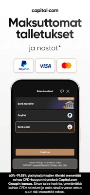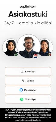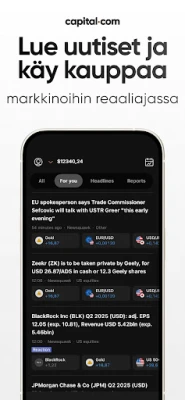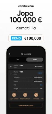 Sukella dynaamisten markkinoiden ytimeen Capital.comin avulla, joka on suunniteltu moderniin CFD-kaupankäyntiin. Liity yli 750 000 sijoittajan joukkoon, jotka hyödyntävät Capital.comin kattavaa alustaa yli 4 800 eri CFD-markkinan parissa. Olitpa kiinnostunut osakkeista, indekseistä kuten SP500 tai US100, globaaleista valuutoista, kullan kaltaisista hyödykkeistä, uusimmista kryptoista tai ETF-rahastoista, Capital.com tarjoaa intuitiivisen portin laajaan valikoimaan arvopapereita ja kohde-etuuksia. Koe todellinen pörssikaupankäynnin vapaus yhdessä sovelluksessa.