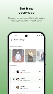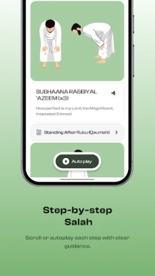 Sovellus tarjoaa ainutlaatuisen oppimiskokemuksen, joka käsittää jokaisen Salahin vaiheen selkeiden kuvien, äänirecitaatioiden, translitteroinnin ja käännösten kera. Voit seurata koko rukousvirtaa niyyahista salamiin saakka automaattisesti tai edetä omaan tahtiisi, oppien recitaatioita pala palalta. Mukauta kokemustasi valitsemalla erilaisia kuvapaketteja ja lukijoita sekä määrittämällä, mitkä suurat sisällytetään kuhunkin rukoukseen. Lisäksi saat selkeän, visuaalisen oppaan Wudhuun vaihe vaiheelta ja pääset lukemaan hyödyllisiä artikkeleita Salahin säännöistä, merkityksestä ja yleisimmistä virheistä.