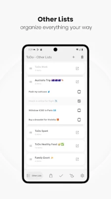 Aloita päiviesi tehokas hallinta ja unohda kaaoksen tunne. Tämä sovellus on suunniteltu mullistamaan tapasi organisoida arkesi. Luo vaivattomasti rajattomia listoja – olipa kyseessä sitten päivittäiset työtehtävät, viikon ostoslista, unohtumattomat matkasuunnitelmat tai jokin ainutlaatuinen projekti, joka vaatii systemaattista lähestymistä. Joustava rakenne antaa sinulle täyden vapauden muokata jokaista listaa omien tarpeidesi mukaiseksi, varmistaen, että jokainen luettelo palvelee tarkoitustaan optimaalisesti. Pidä kaikki tärkeä yhdessä paikassa, selkeästi ja jäsennellysti.