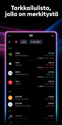 Räätälöi markkinaseurantasi TradingViewin yksilöllisten tarkkailulistojen ja hälytysten avulla. Seuraa reaaliajassa haluamiasi globaaleja indeksejä, osakkeita, valuuttapareja, joukkovelkakirjoja, futuureja, rahastoja, hyödykkeitä ja kryptovaluuttoja, ja varmista, ettei yksikään merkittävä markkinamuutos jää huomaamatta. Hälytykset auttavat sinua reagoimaan ajoissa, maksimoiden tuottosi. Lisäksi TradingView on aktiivisin kauppiaiden ja sijoittajien sosiaalinen verkosto. Verkostoidu miljoonien ammattilaisten ja harrastajien kanssa ympäri maailmaa, jaa ideoita ja opi yhteisön kokemuksista. Tiliesi synkronointi varmistaa, että kaikki tallennetut muutokset, ilmoitukset ja analyysit ovat saumattomasti käytettävissäsi kaikilla laitteillasi, missä ja milloin tahansa.