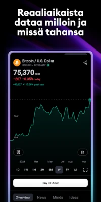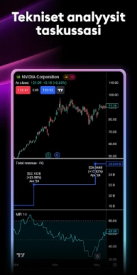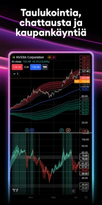 TradingViewin avulla analyysityökalusi ovat vertaansa vailla. Koe edistykselliset kaaviot ja indeksit, jotka kilpailevat jopa työpöytäalustojen laadun kanssa suoraan mobiililaitteellasi. Sovelluksesta löydät kaikki työpöytäversion ominaisuudet, asetukset ja työkalut, tinkimättömällä tarkkuudella. Valitse yli kymmenestä eri kaaviotyypistä, aina perusviivasta ainutlaatuisiin Renko- ja Kagi-kaavioihin, jotka paljastavat hintojen todellisen dynamiikan ajasta riippumatta. Hyödynnä laajaa valikoimaa analyysityökaluja, kuten indikaattoreita, strategioita ja piirto-objekteja, auttamaan sinua tunnistamaan pitkän aikavälin trendejä ja potentiaalisia tuottomahdollisuuksia.