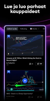 TradingView on helppokäyttöinen aloittelijoille ja tehokas asiantuntijoille. Se tarjoaa kaikki työkalut kaupankäynti-ideoiden julkaisemiseen ja katseluun. Saat reaaliaikaiset noteeraukset ja indeksit missä ja milloin tahansa.