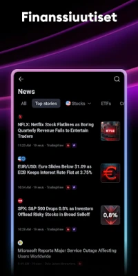 Aloita matkasi finanssimarkkinoiden sydämeen TradingViewin avulla, alustalla, joka tuo ammattitason markkinadatan suoraan sormiesi ulottuville. Hyödynnä tarkkoja reaaliaikaisia noteerauksia osakkeista, futuureista, indekseistä, Forexista, Bitcoinista ja hinnanerosopimuksista, jotka kaikki tulevat alan johtavilta palveluntarjoajilta. Seuraa helposti maailman suurimpia pörssejä ja laajoja indeksejä, kuten NASDAQ Compositea, S&P 500:aa ja Dow Jonesia, ja syvenny valuuttakursseihin, öljyn hintaan, rahastoihin, joukkovelkakirjoihin ja hyödykkeisiin. TradingView on suunniteltu antamaan sinulle kattava näkymä markkinoihin, olitpa sitten kokenut sijoittaja tai vasta-alkaja.
