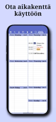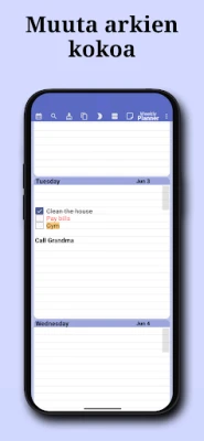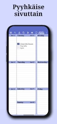 Avaa ovi vaivattomaan ajanhallintaan digitaalisen suunnittelijan avulla. Sen ainutlaatuinen viikkonäkymä esittelee koko seitsemän päivän kulun yhdellä silmäyksellä, tarjoten vertaansa vailla olevan yleiskuvan tulevista sitoumuksistasi, tapaamisistasi ja tärkeistä tapahtumista. Selaa menneiden tai tulevien viikkojen välillä sulavasti pyyhkäisemällä, tehden aikataulusi hallinnasta intuitiivista ja nopeaa. Rakenna yksityiskohtaisia päiväohjelmia tai hahmottele koko viikon suunnitelmat käden käänteessä – tästä työkalusta tulee pian korvaamaton osa tehokasta arkeasi.