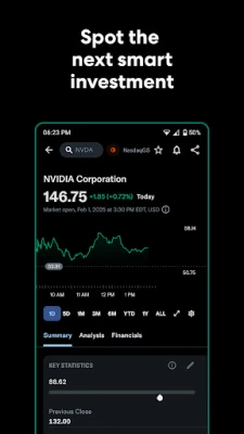 Hallitse sijoituksiasi vaivattomasti. Sovelluksen kotinäkymä antaa sinulle välittömän yleiskuvan henkilökohtaisen salkkusi kehityksestä, ja voit linkittää olemassa olevat portfoliot seurataksesi omistuksiasi liikkeellä ollessasi. Seuraa haluamiasi kohteita saadaksesi reaaliaikaisia kursseja ja ajankohtaisia uutisia. Saat push-ilmoituksia esimerkiksi NASDAQin, Dow Jonesin, Bitcoinin, öljyn tai kullan markkinoilta, joten et jää mistään paitsi. Syvenny yksityiskohtaisiin taloustietoihin, kuten historiallisiin lukuihin, ESG-luokituksiin ja suurimpiin omistajiin, tai vertaile osakkeita interaktiivisten koko näytön kaavioiden avulla. Laajenna näkökulmaasi ja seuraa myös valuuttoja, hyödykkeitä, maailman indeksejä ja futuureja.